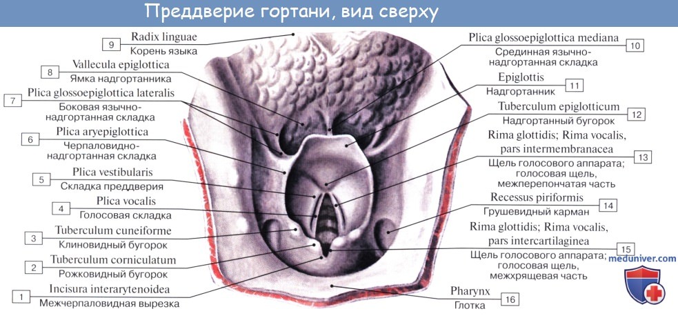 Полость гортани, cavitas laryngis, открывается отверстием — входом в гортань, aditus laryngis. Оно ограничено спереди свободным краем надгортанника, сзади — верхушками черпаловидных хрящей вместе со складкой слизистой оболочки между ними, plica interarytenoidea, с боков — складками слизистой оболочки, натянутыми между надгортанником и черпаловидными хрящами, — plicae aryepiglotticae. По бокам последних лежат грушевидные углубления стенки глотки, recessus piriformes.