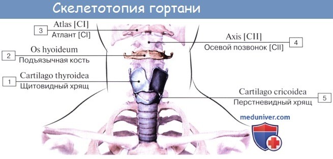 Гортань, larynx, помещается на уровне IV, V и VI шейных позвонков, тотчас ниже подъязычной кости, на передней стороне шеи, образуя здесь ясно заметное через наружные покровы возвышение. Сзади нее лежит глотка, с которой гортань находится в непосредственном сообщении при помощи отверстия, называемого входом в гортань, aditus laryngis. По бокам гортани проходят крупные кровеносные сосуды шеи, а спереди гортань покрыта мышцами, находящимися ниже подъязычной кости (mm. sternohyoidei, sterno-thyroidei, omohyoidei), шейной фасцией и верхними частями боковых долей щитовидной железы. Внизу гортань переходит в трахею.